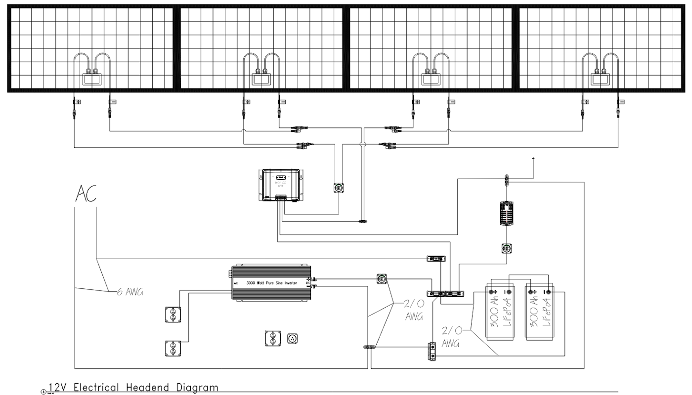 Let's take a look at a 12V/120V wiring diagram for a typical CTC with a solar system and a 3,000 Watt Inverter for 120V power.
