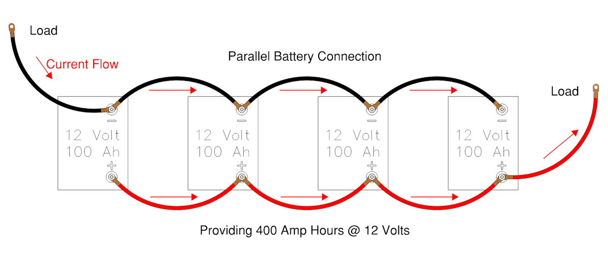 When you connect in Parallel, your Voltage remains the same, but Amperage is additive, as illustrated in the drawing below.