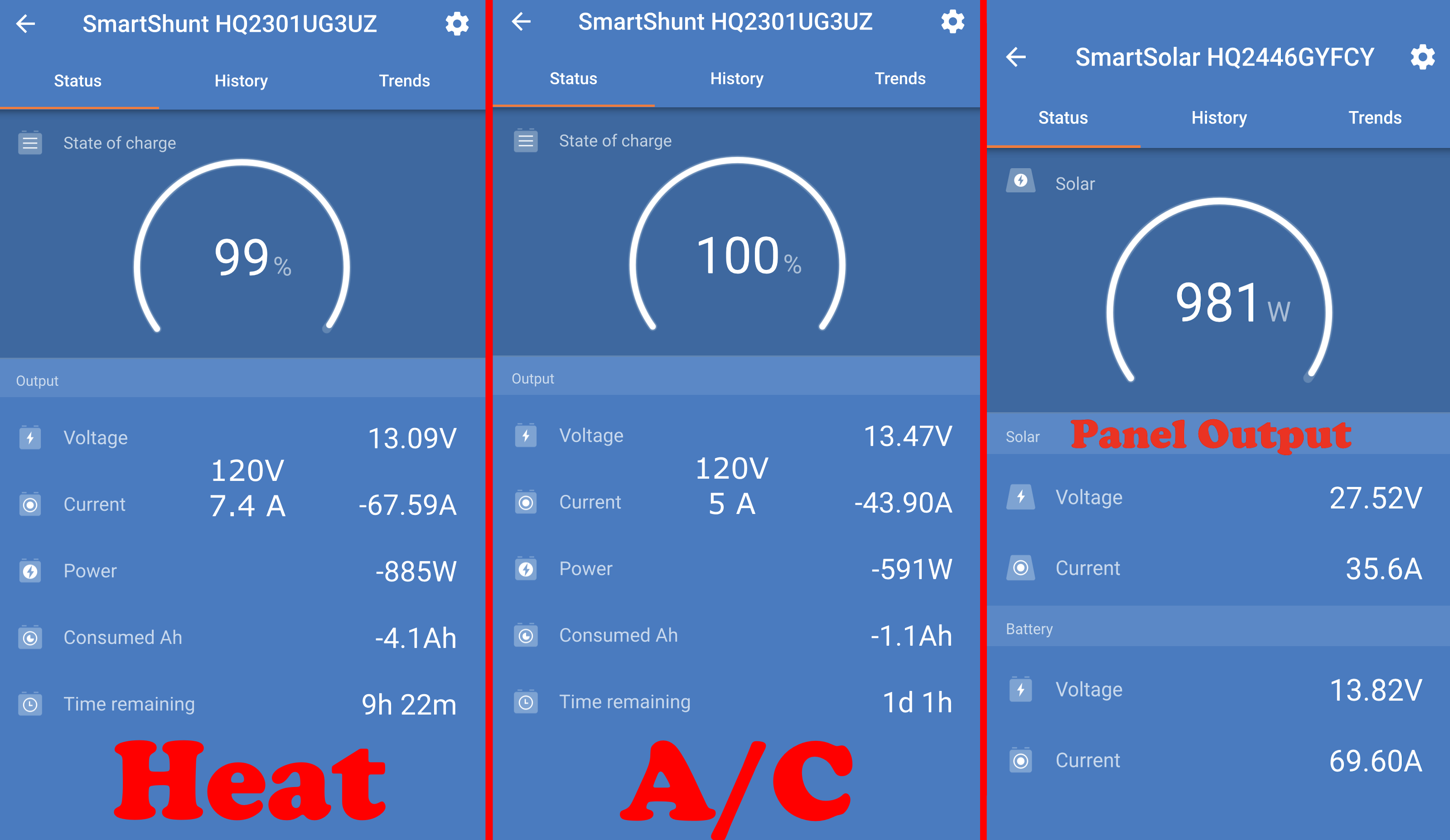 The brand new higher voltage panels were putting out 78% of their rated potential and 66.1 Amps or a 52.6% increase in Amps to the battery.