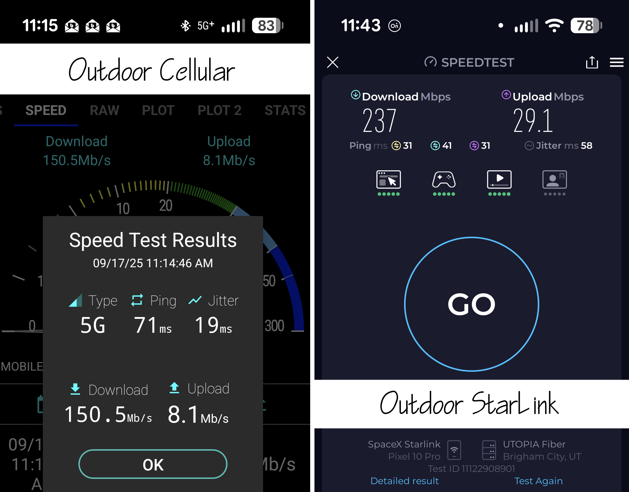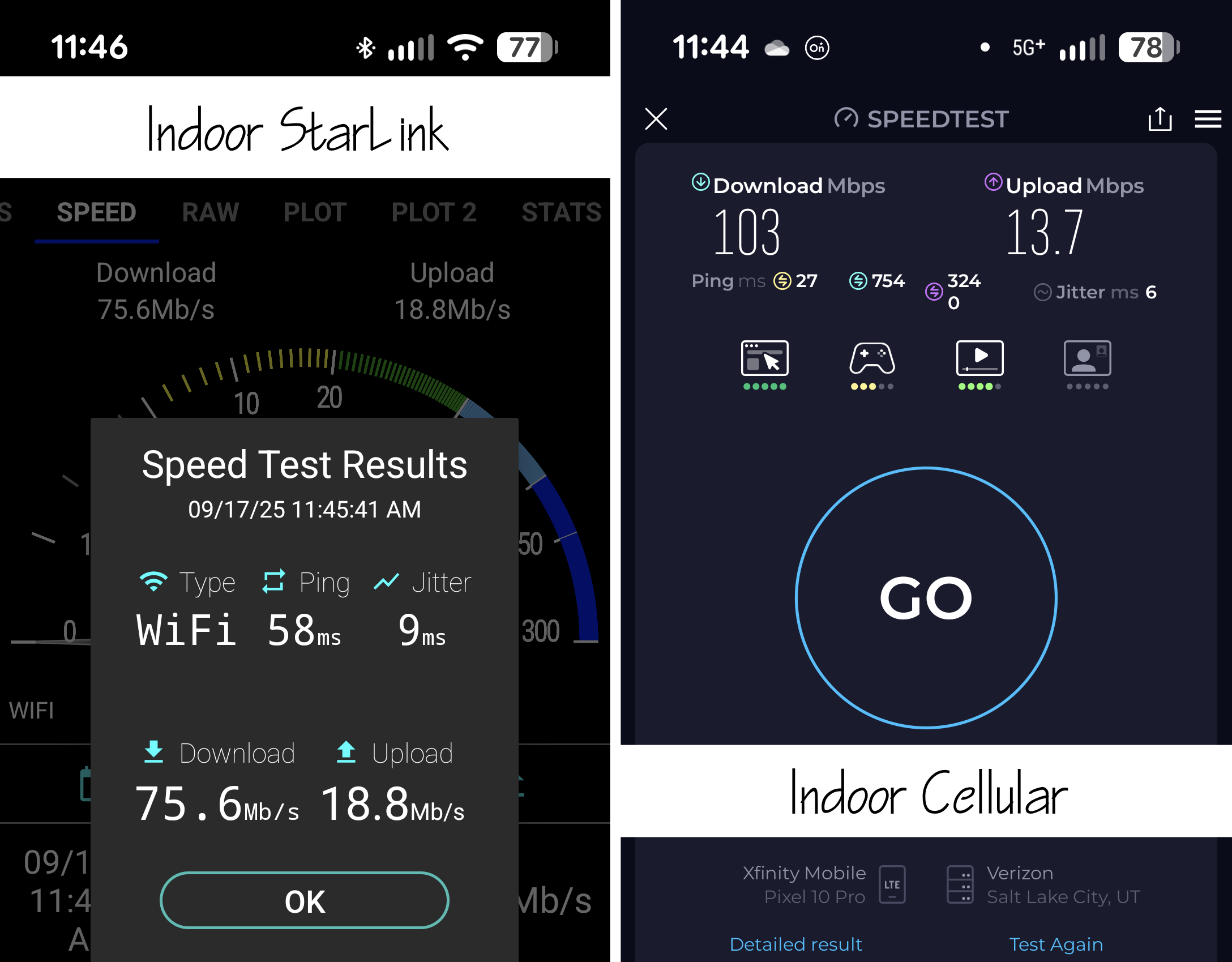 These tests are meant to illustrate the difference Outdoor vs Indoor, and not to compare Cellular vs Starlink.