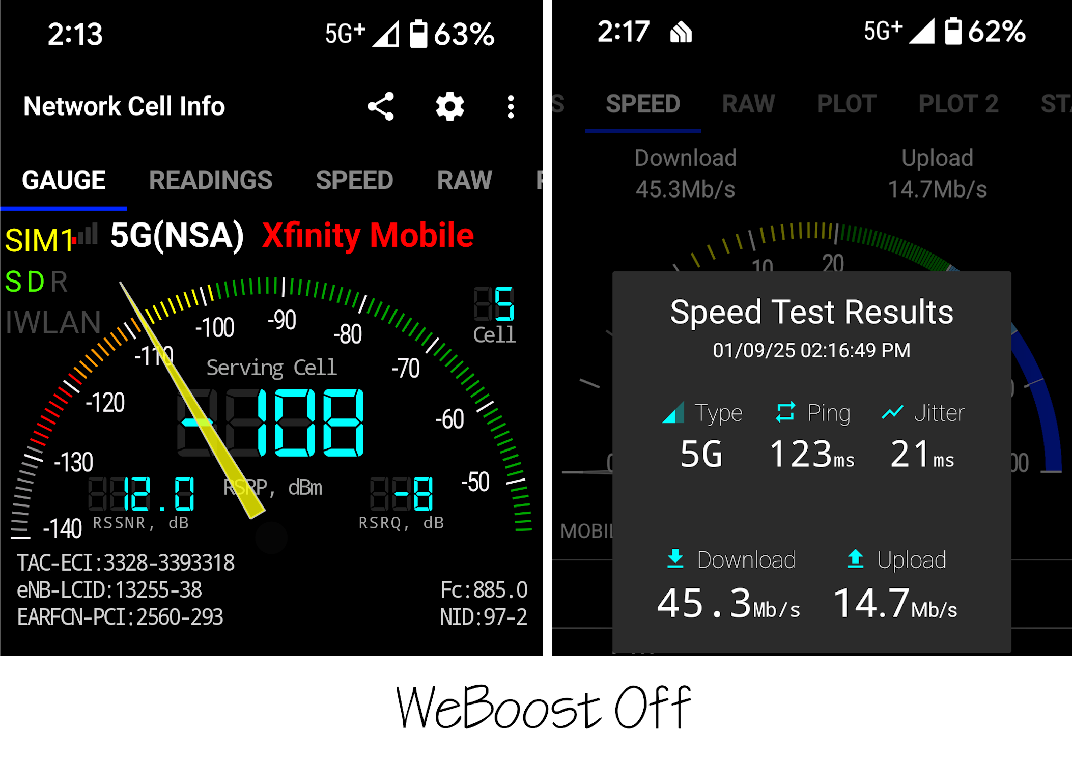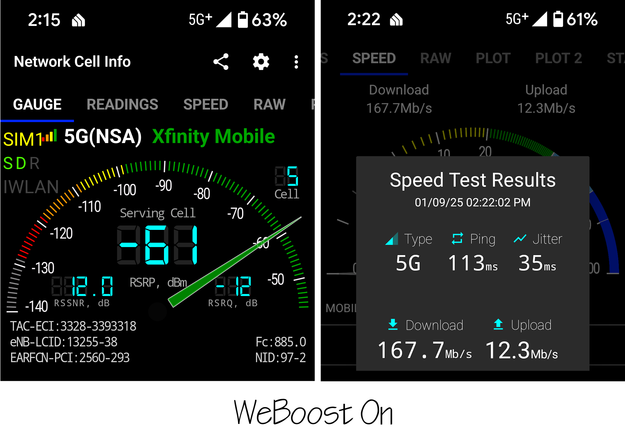 How does the WeBoost setup affect the real world connection speedtests between no boost and having the unit on inside our CTC.