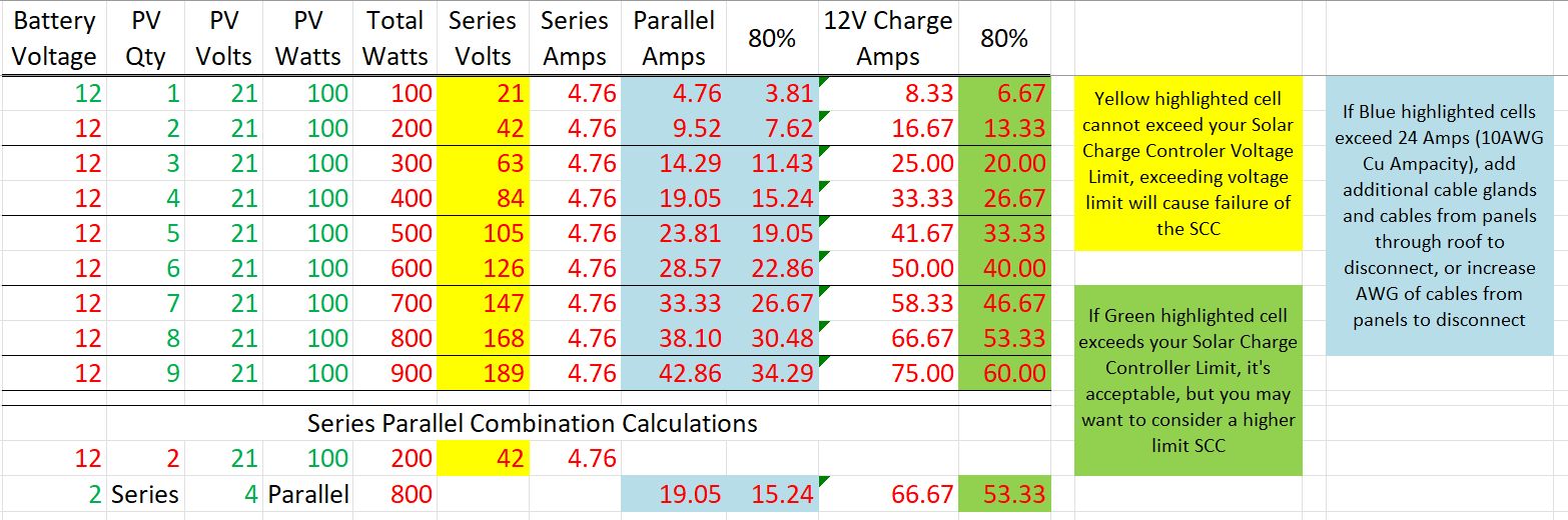 The chart also show a 2 Series/4 Parallel configuration to help understand the basics of Series/Parallel configurations.